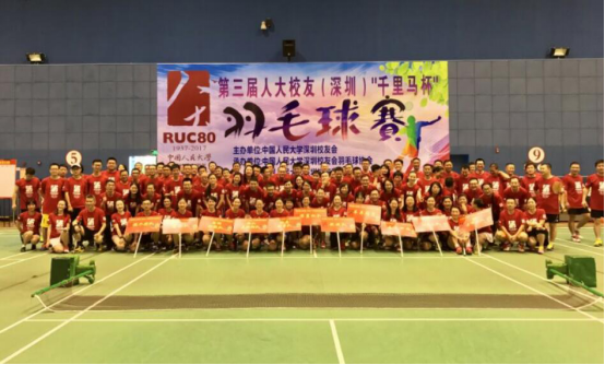 9月16日,由深圳千里馬裝飾集團冠名贊助的第三屆人大校友(深圳)“千里馬杯”羽毛球賽在東莞李永波學校隆重舉行。這項賽事已連續舉辦三年,是由深圳人大校友會主辦,深圳人大校友羽毛球協會承辦,深圳人大商會協辦,由深圳千里馬裝飾集團冠名贊助的羽毛球盛會。之前兩屆在深圳舉行,今年在著名的國家羽毛球訓練基地-東莞李永波學校舉行,比賽得到了深圳人大校友會,商會的大力支持。 本次比賽吸引了來自北京、佛山、廣州、海南、廈門、東莞等六支外地球隊和深圳五支球隊共11支外地球隊的參與。賽程設置為為單循環賽,隊隊見面,每支球隊打10場比賽,分男雙一、混雙、男單、男雙二、女雙五盤,每盤31分決勝負,五局三勝制。 比賽異常激烈,傳統強隊白羽打鐵隊、88去哪兒隊、廣州羊羊得壹隊、深圳商會隊、MBA隊以及今年新參與的北京搞事隊,海南隊都有角逐冠軍的野心和實力!特別是北京搞事隊以退役校隊選手為班底,來者不善!各個隊的隊長為了贏得勝利,專門派出班探,觀看主要對手排陣陣容,為了贏得比賽,甚至動用了“田忌賽馬”的策略,隊長們斗智,場上球員斗勇,大家你來我往,互不相讓,大力扣殺、劈吊、擋網、平抽、放網,羽球在空中快速翻飛,四周啦啦隊不禁大聲喝彩。其中,不下五場比賽比分為30:30,以最后一分決勝負! 上午打完比賽后,賽程過半,海南隊、廣州隊、商會隊相互循環,各輸一場,需通過小比分決出冠軍。下午比賽中,MBA強力阻擊了海南隊,但最終以千里馬裝飾董事長李向東為隊長的商會隊在比賽中更勝一籌,以大比分贏得本次比賽冠軍,海南隊亞軍、廣州羊羊得壹隊季軍、北京搞事隊第四名、88去哪兒獲第五名。  當晚還舉行了隆重的頒獎儀式和晚宴,深圳校友會周會長親臨現場為獲獎隊伍頒獎!校友在一起開懷暢飲,收獲了健康、友誼和快樂! 感謝本次賽事的組織者李俊毅會長、湘荔以及眾多組委、志愿者。感謝保時捷表、艾美美業、全棉時代等眾多校友企業家贊助的獎品,感謝眾多校友對本次賽事的支持,期待明年再相見!