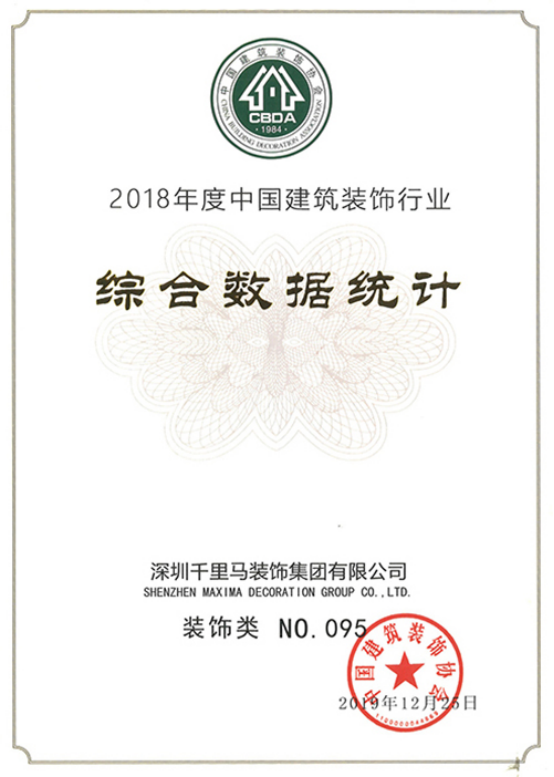 2019年12月24日,中國建筑裝飾協(xié)會揭曉了2018年度中國建筑裝飾行業(yè)數(shù)據(jù)綜合統(tǒng)計結(jié)果,深圳千里馬裝飾集團榮獲裝飾百強第95名。